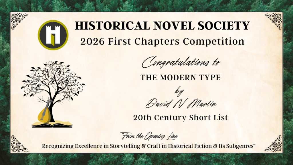 For David N. Martin, this is his second time on the Historical Novel Society’s short list for first chapters. His previous novel ‘The Typewriterists’ was also short listed. That novel was eventually published by Forged Truth Publishing, winning the 2025 Norman King Award for Fiction. His follow up ‘THE MODERN TYPE’ is a sequel to the story of the Havershall and Woodmansey family dynasty that began in ‘The Typewriterists’, described by its author as ‘Downton Abbey meets Peaky Blinders… with typewriters’.